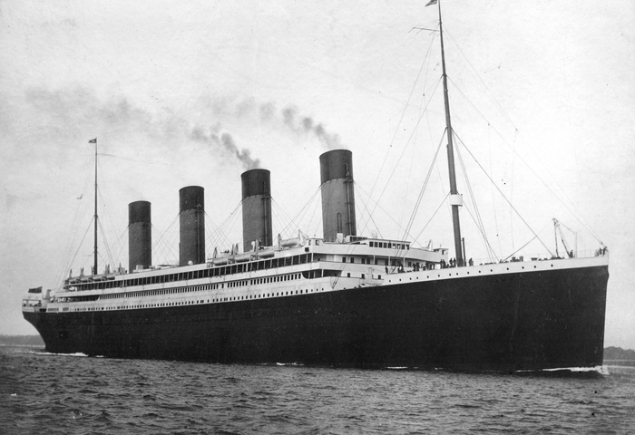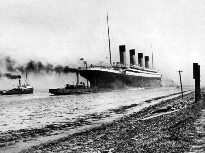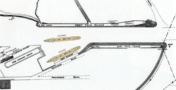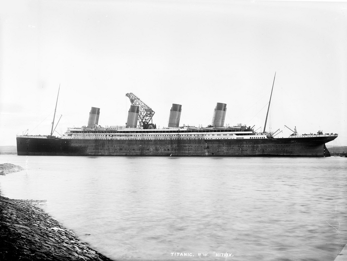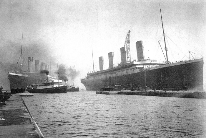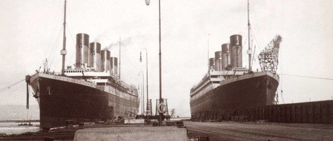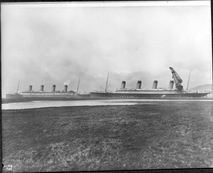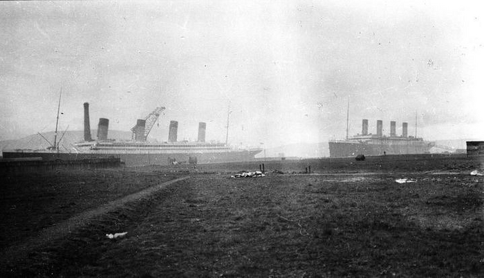 Известная фотография двух гигантов, стоящих параллельно друг другу, загораживая собой весь горизонт. На данном фото «Титаник» (слева) все еще продвигается вглубь дока (NMNI).