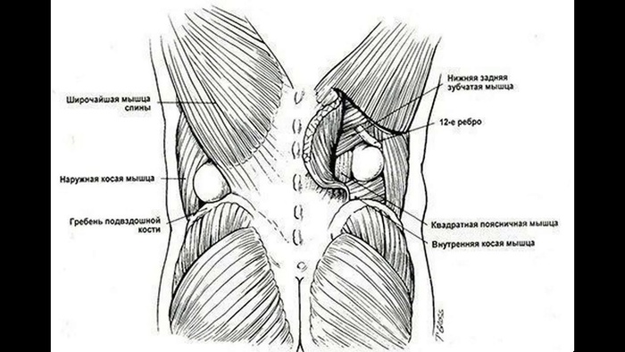 Поясничные грыжи: слева – в треугольнике Пти, справа в ромбе Лесгафта-Грюнфельда