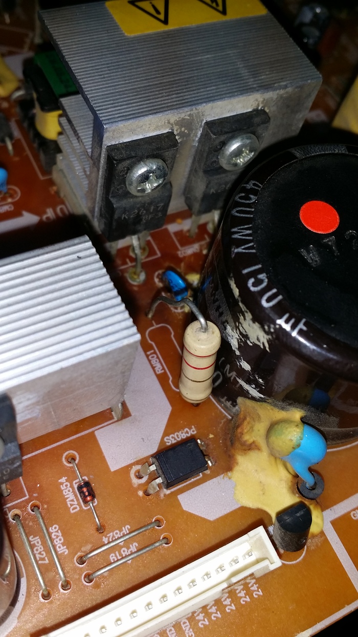Конденсатор под компаундом (на фото можно его заметить, ляпушки жёлтого цвета) коротнул и выжег резистор (RM801). На фото также заметно прогар на текстолите между выводами конденсатора. Весь ремонт обошёлся чисткой платы от прогара, заменой конденсатора и резистора. Ну ещё и термистора, убитого владельцем. на фото детали уже впаяны.