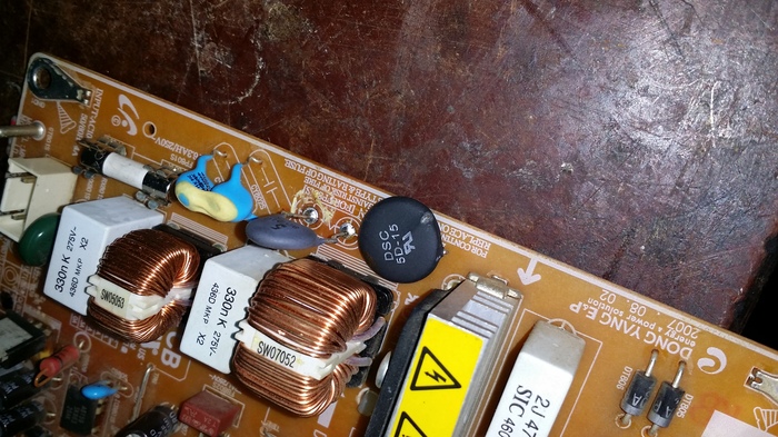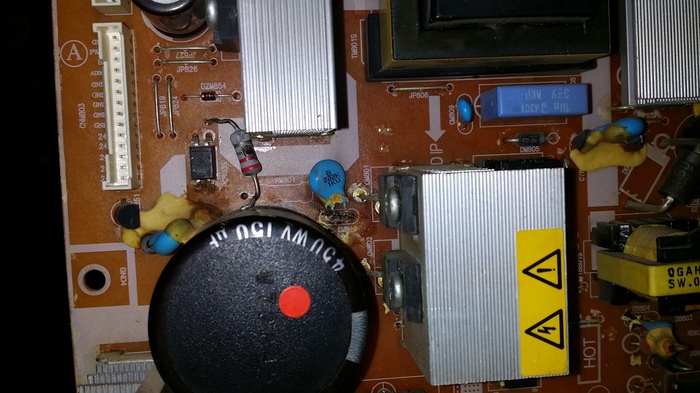 Коллега этот сначала пытался сам доломать починить, выкусил зачем-то термистор с платы, да под самый корень, телевизор после этого всё так же пытался отправиться в Вальгаллу, в итоге коллега сдался и притащил телевизор ко мне)) Фото невинно убиенного, рядом уже впаял новый.