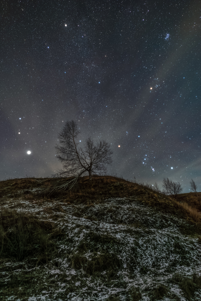 Ранним утром в конце сентября трава покрылась инеем. Слева зодиакальный свет, справа знаменитые зимние созвездия⁠⁠