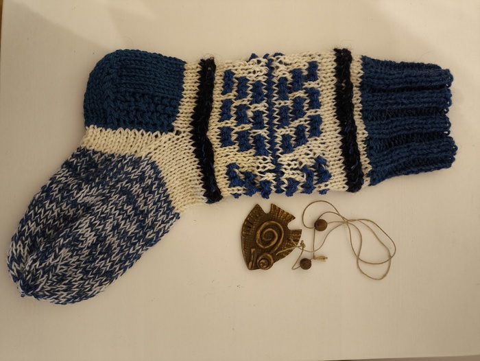 Помню, как в детстве бабушка Таня пела мне уютную классическую колыбельную "рыбки уснули в пруду", а бабушка Сальге - веселую песенку на крымско-татарском про камсу: хозяйка жарила камсу, отошла, вернулась - "камса ёкъ" (камсы нет). Сгорела рыба, только хвост остался. Узор "рыбий хвост" на крымском полотенце-иджияре из коллекции московского Музея Востока я и взяла для носков. А глиняная рыбка из Волгореченска приплыла, но похожа на диковинных рыб из Евпаторийского музея.