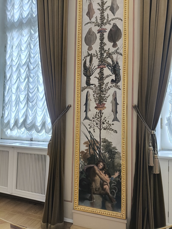 Там же в Строгановском дворце - дивной красоты рыбы, копии фресок лоджий Рафаэля. Да, они не только в Зимнем дворце есть. Когда по приказанию Екатерины Великой сняли копии с работ Рафаэля и его учеников в Ватиканском дворце, не все они поместились в Зимний дворец. Часть копий тогда купил граф Александр Строганов, гораздо позднее, в 1840-х годах их использовал архитектор Пётр Садовников при создании великолепной Арабесковой гостиной.