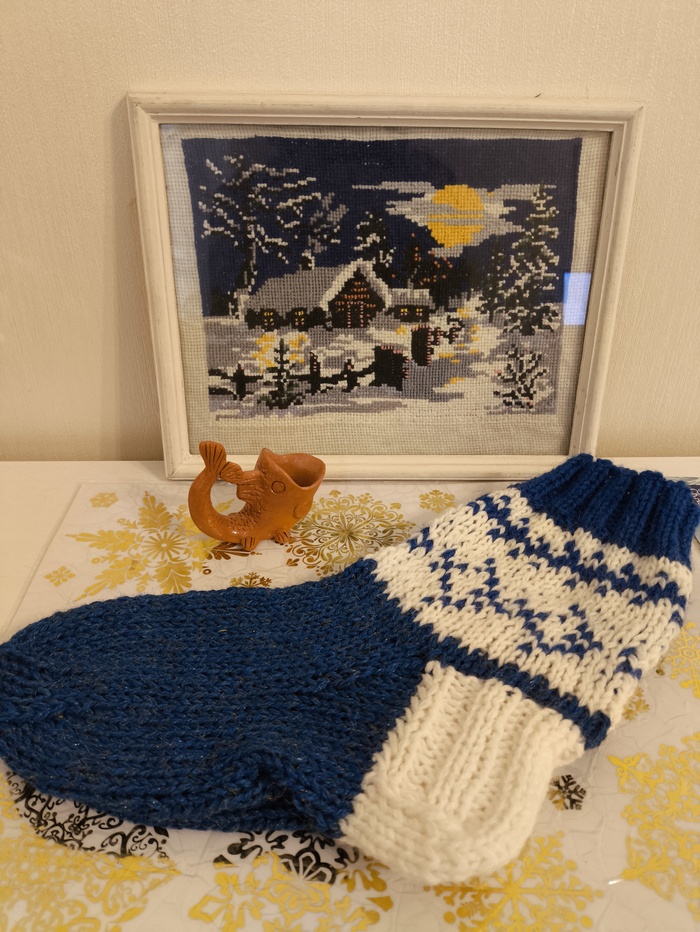 Рыбок на носки "насажала" побольше, они в подарок с пожеланиями благосостояния. Рыба, хоть она в фольклоре - существо Нижнего мира, но и добро несёт, вот в коми языке даже «деньги» и «чешуя» называются одинаково - "СЪОМ". Только правильно желание надо загадывать!