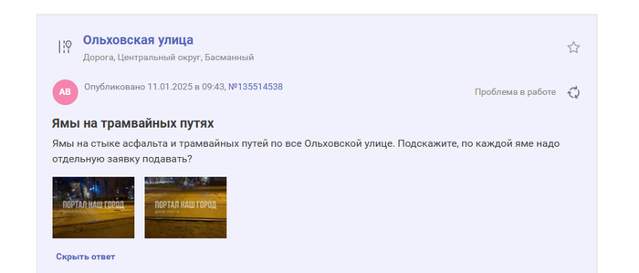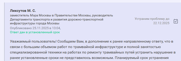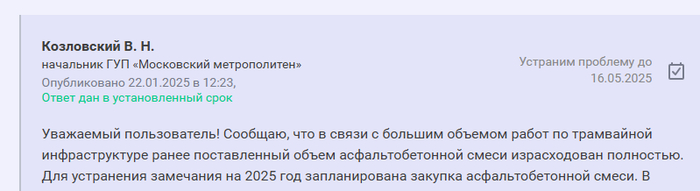 Уважаемый пользователь! Сообщаю, что в связи с большим объемом работ по трамвайной инфраструктуре ранее поставленный объем асфальтобетонной смеси израсходован полностью. Для устранения замечания на 2025 год запланирована закупка асфальтобетонной смеси. В связи с тем, что в период устойчивых отрицательных температур укладка асфальтобетонной смеси прекращена, работы по восстановлению покрытия трамвайных путей будут выполнены в весенне-летний период 2025 года, при наступлении устойчивых положительных температур в соответствии с технологическим процессом. Информация о ходе устранения замечания будет представлена в срок до 16.05.2025 (с учетом времени, необходимого для заключения контракта). Угроза безопасности движения отсутствует, с целью обеспечения безопасности выполнены локальные работы по восстановлению покрытия трамвайных путей.