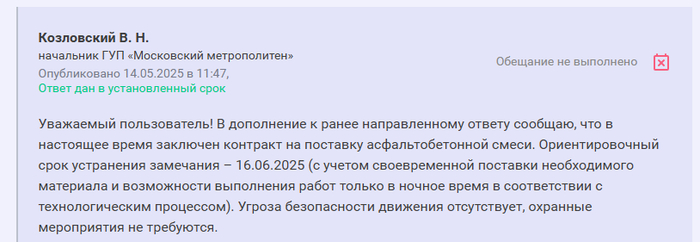 В июне начальник ГУП «Московский метрополитен» Козловский В. Н. опять обосрался, но в этот раз поступил умнее, заложил на поиски асфальта сразу 3 месяца до сентября.