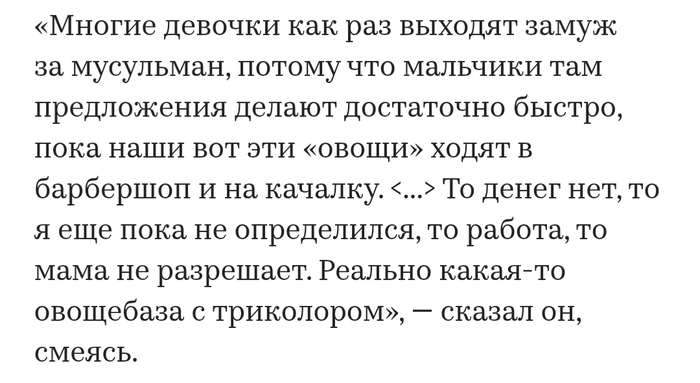 По его словам, «наши овощи» ходят в качалку и барбершоп, затягивая с женитьбой, и русские девушки выбирают в мужья мусульман, потому что те быстрее делают предложение.