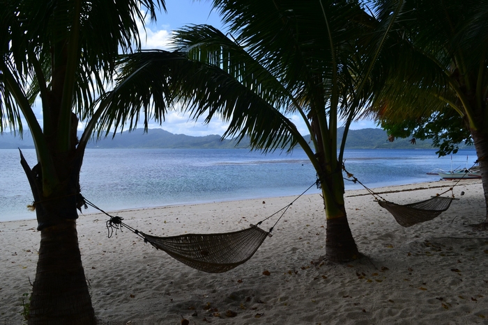 На берегу, в тени пальм для посетителей острова оборудованы гамаки