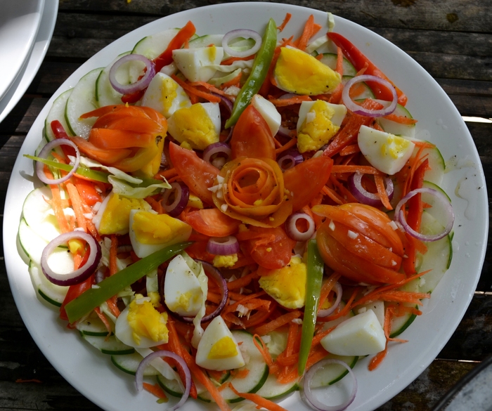 Приготовив еду и сервировав стол (обратите внимание - тарелки и приборы не пластиковые, а "нормальные"), экипаж удалился в свой домик, пригласив нас к нашему столу