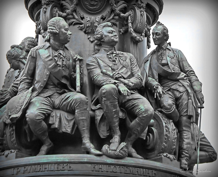 Вокруг пьедестала расположены девять фигур видных деятелей екатерининской эпохи, скульптуры созданы Александром Опекушиным.