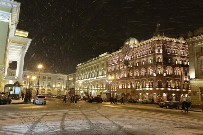 Возможно, именно так этот дом выглядел весной 1879 г., когда площадь использовалась — впервые в России — для опытов электрического освещения, организованных товариществом изобретателя П.Н. Яблочкова.