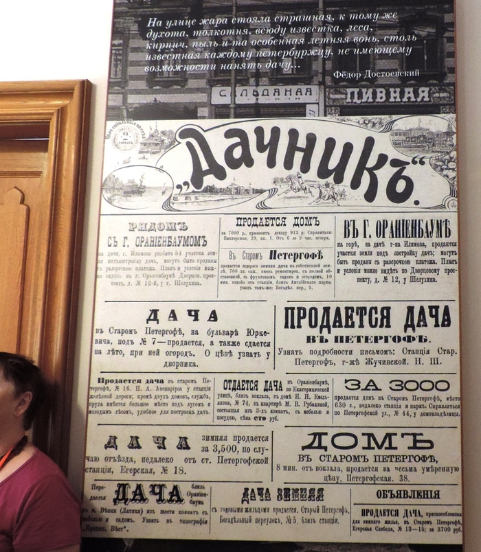 Во второй половине XIX столетия понятие "дача" вошло в широкий обиход для обозначения загородного летнего дома для городской семьи, а вокруг императорской резиденции в Петергофе начал формироваться особый дачный мир. Несколько поколений Романовых проводили лето в Петергофском парке Александрия, где обретали некоторую свободу от сковывающих их жизнь придворных условностей. На "собственной даче" каждый имел возможность предаваться любимым занятиям: ловле рыбы, охоте, сбору грибов и ягод, конным и пешим прогулкам, поездкам на велосипеде и играм на открытом воздухе. Вслед за царской семьей в Петергоф переезжало высшее общество: лица императорской свиты, аристократы, чиновники, генералы и офицеры, интеллигенция, состоятельные горожане. Среди известных петергофских дачников были представители семейства Бенуа, М.Г. Врубель, Э.Л. Ган, М.Ф. Кшесинская, Д.И. Менделеев, Н.А. Некрасов, А.Г. Рубинштейн, Ф.Г. Сан-Галли, С.М. Третьяков, И.С. Тургенев, П.И. Чайковский и многие другие.