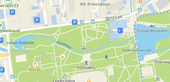 Северная часть парка организованна вокруг р. Рогатки, котрая течет из о. Верхнего, в, пад-да-бам, о. Нижнее. Не заморачивались😜.