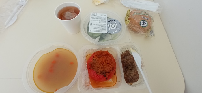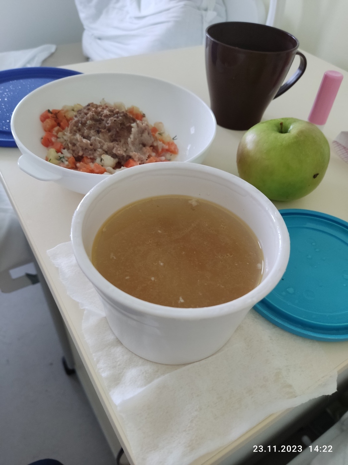 Потом обед. Тут побольше и повкуснее: перец печёный с морковью(к ней у меня вопросы, знаю, что варёная морковь может сахар повысить, поэтому чутка поковыряла и съела лишь перец), суп гороховый, тефтельки говяжьи, салат, компот. Соседка моя часто что-то не ест и отдаёт мне: салат или йогурт, а сама пьёт кофе со сладкими вкуснятинами 😄 повезло блин))