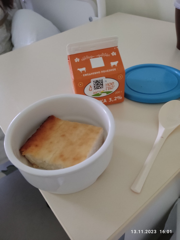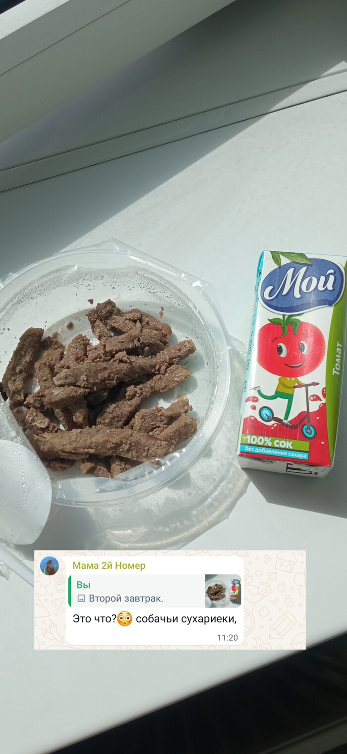 Потом мне принесли второй завтрак: говядину запеченую и сок томатный. Мама решила, что это собачьи сухарики 😅. По вкусу нормальная обычная столовская еда.