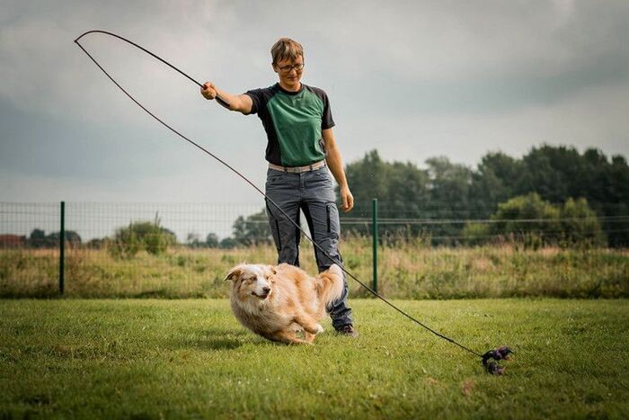Добычное поведение можно мягко развивать. Поэтому многие инструкторы так любят «удочки»: привязанная к удочке игрушка вдруг оживает, меняет траекторию, исчезает и снова появляется. Предмет как будто получает характер, и именно это запускает в собаке древнюю программу преследования.