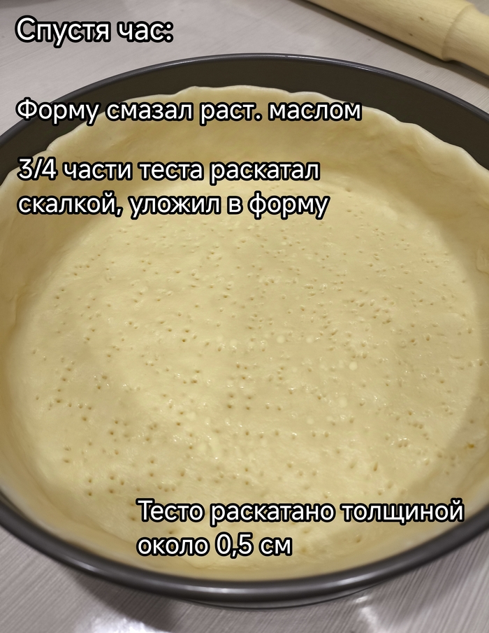 Перемешиваем и перекладываем в тарелку, чтобы начинка у нас немного остыла. Если будет горячая, тесто потечет в процессе сборки. После того, как начинка остыла, начинаем собирать пирог. Раскатываем тесто в тонкий пласт. Смазываем форму сливочным маслом (у меня форма диаметром 26 см) и выкладываем в нее нижний слой теста.