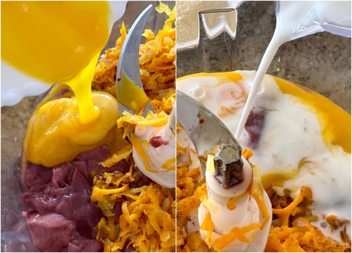 В чаше блендера соединил печень, овощи, желток, сливки.