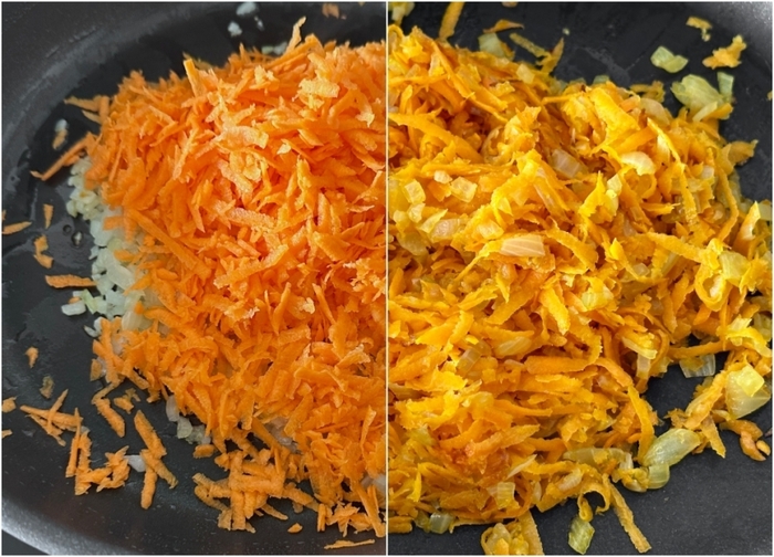 Потом добавил морковку и в том же режиме, постоянно вороша-перемешивая, получил вот такую овощную смесь. Очень ароматную, мягкую, сладко-островатую.
