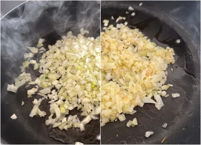 Лук. Нарубил мелко. И в сковороду его к хорошо прогретому маслу. Масло именно хорошо прогреть, а не раскалять. И лук не обжаривать там, а купая в разогретом масле довести до полупрозрачности. Идеально добиться, чтобы ушел резкий аромат и вкус лука.