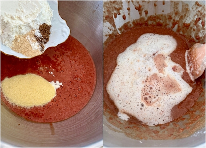 Добавил манку, муку, специи-приправы. Перемешал. А потом в получившуюся смесь вмешал, что называется, пену белковую. Но очень аккуратно.