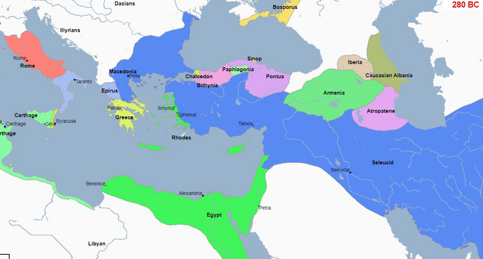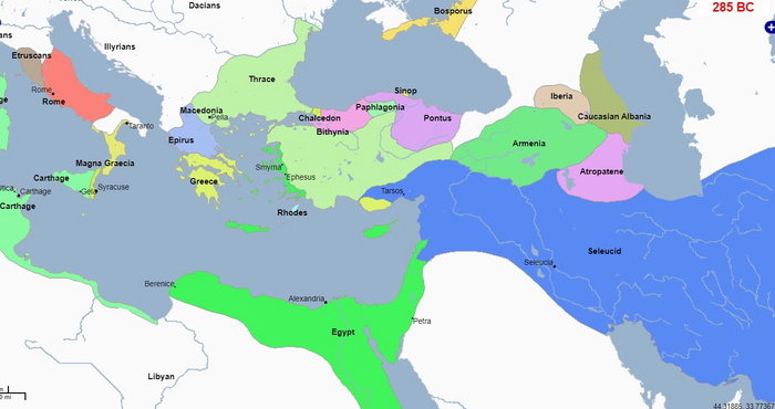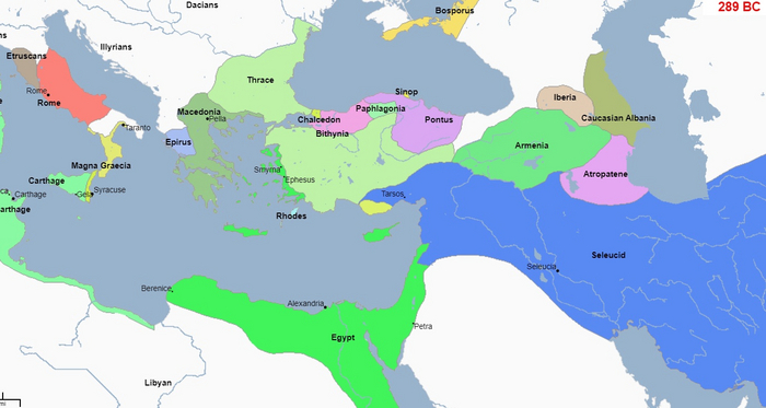Чтобы понять то, что произойдет дальше, вернемся на двадцать один год назад в 301 год до н.э. – битва при Ипсе. Полководцы Александра Великого делят его державу – Антигон Одноглазый со своим сыном Деметрием против коалиции Селевка, Лисимаха и Плейстарха. Семьдесят тысяч против шестидесяти четырех. Деметрий на правом фланге во главе со всадниками смял противостоящий левый фланг союзников, устремившись в погоню. Его отец, Антигон в центре вел ожесточенный бой – фалангу окружили, но он до последнего оставался в бою, ожидая прихода сына. Деметрий отчаянно пытался прорваться на помощь к отцу… Навстречу Деметрию выступил Селевк, будущий основатель могучей державы Селевкидов.