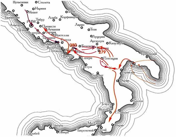 Здесь стоит немного пояснить взгляды и философию римского общества того времени, Аппий Клавдий давил на самое больное – потерю римлянами virtus. Термин, ближайший аналог, которого в современном языке – честь, хотя, конечно, он был многогранным: добродетель, доблесть, достоинство. Естественно, отдавленное самолюбие было, вряд ли единственной причиной отказа от переговоров – Рим обладал значительными мобилизационными возможностями, не даром Киней сравнивал их с лернейской гидрой, которая отращивает голову на месте отрубленной. Кроме того, никуда не делись экспансионные амбиции вечного города, ну и плюс к моменту посольства Кинея римляне уже успешно завершили войну с этрусками, а значит, высвободили опытные войска. Кто знает, не тянул ли Рим время, играя в переговоры?Как бы то ни было, предложения Кинея отвергли, и он отправился к Пирру с ответом, что пока эпиротец не отступит до границ 280 года, мира не будет.
