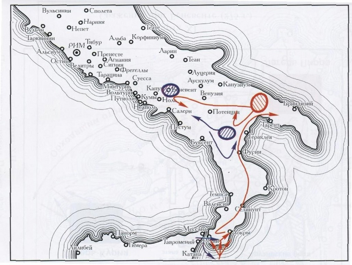 В ходе переправы обратно в Италию, по версии некоторых античных авторов, Пирр традиционно потерял в море всех. Ну, и по славной традиции с воскресшим из ниоткуда войском, разбил мамертинцев в количестве 10 000 человек. Сам царь получил ранение головы и пока его прикрывали гипасписты (личная гвардия), из рядов мамертинцев вышел грозный воин, вызывая Пирра на поединок, пока полководец не умер. Раздраженный эпирот растолкал телохранителей, которые пытались его удержать, вышел к противнику и одним ударом разрубил того надвое. Сомневаться в доблести царя не приходится, но вот возможности меча махайры (на ксифос я даже не ставлю) в руках Пирра явно были ограничены. Поэтому, полагаю, что все же на две половинки распался не весь мамертинец, а только его голова – такие травмы нам известны по найденным черепам фиванцев, убитых при Херонее. Впрочем, и этого хватило, чтобы энтузиазм врагов Пирра резко угас. В Тарент царь прибыл в сопровождении 20 000 пехотинцев и 2500 всадников. Шла зима 275 года.