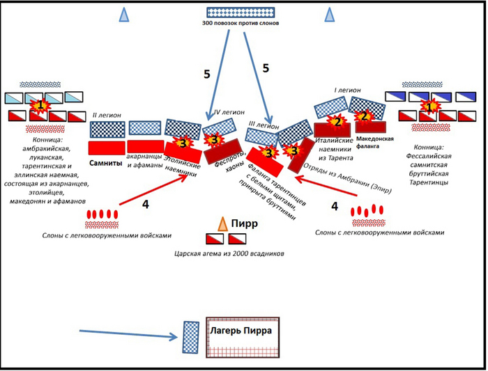 Центр войска занимали племена Эпира, правый фланг войска Пирра достался македонской фаланге – это было самое уязвимое место (крайний воин справа не прикрыт щитом), поэтому там размещали самые надежные войска. Между македонянами и эпиротами строй был заполнен наемниками и мобилизованными тарентинцами, левый фланг составляли греческие наемники, которых замыкали самниты. Оба фланга прикрывала конница, по большей части из местных племен, представляющая в основном дротикометателей, за исключением фессалийцев справа и, вероятно, македонян слева. За главной линией Пирр расположил на удалении по флангам слонов, усиленных легкой пехотой (танки с сопровождением), сам же с царской конной гвардией «агемой» в 2000 человек разместился позади центра.