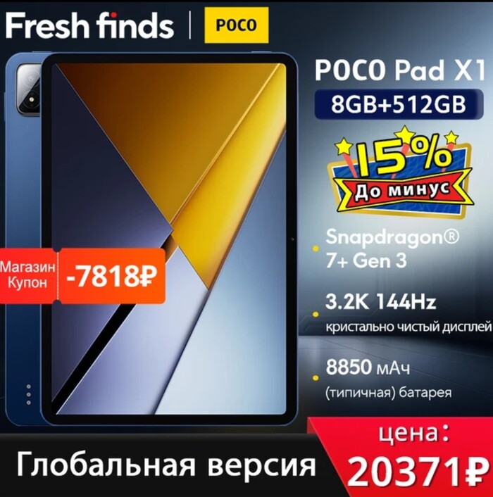 Свежачок от Poco с диагональю 11". Бренд не стал мудрить при запуске и взял проверенную платформу Snapdragon 7+Gen3 с оболочкой Xiaomi HyperOS 2. На борту 8/512ГБ памяти, 8850 мАч аккумулятор и отличный 3.2K экран 144 Гц.