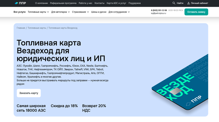Условия: Мультибрендовая сеть из 3000+ АЗС; Скидка до 3.5% от розничной цены; Онлайн-отчетность и личный кабинет; Гибкие лимиты.