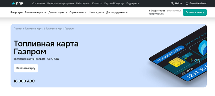 Условия: Мгновенный выпуск карты; Оплата по номеру карты и PIN-коду; Полный контроль через приложение; Сеть из 3000+ АЗС.