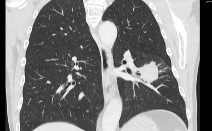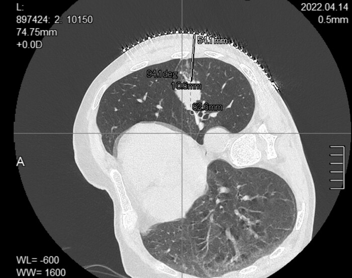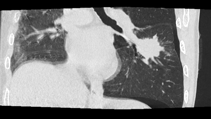 Но вот контрольный скан после интервенции показал небольшой пневмоторакс (черная область в лёгком):