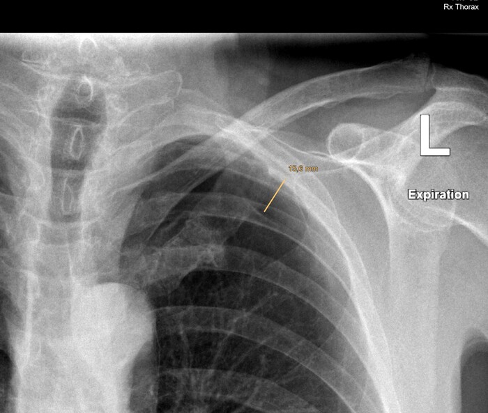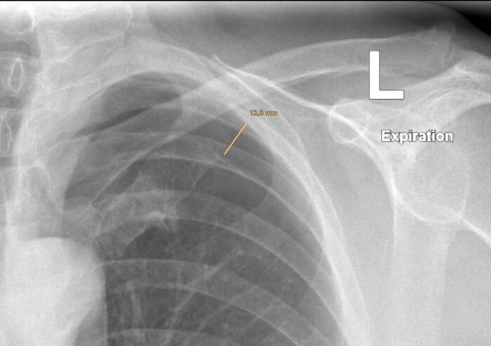 Через 2 часа сделали контроль рентгеном, пневмоторакс ещё виден, но только апикально т.е. на верхушке лёгкого (тут придётся мне поверить, т.к. я смотрел на спец.мониторе с высоким разрешением):