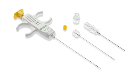 Здесь небольшое отступление: мы делаем часто трукат- или трепан-биопсии. Для этого сначала вводится коаксиальная игла - полая игла, которая служит неким тоннелем для биопсийной иглы - до целевого образования, затем после подтвертждения правильного позиционирования, вводится биопсийная игла и проводится забор тканевых "цилиндров", которые и отправляются патологоанатомам для дальнейшей диагностики. Для этого используем подобные сеты: