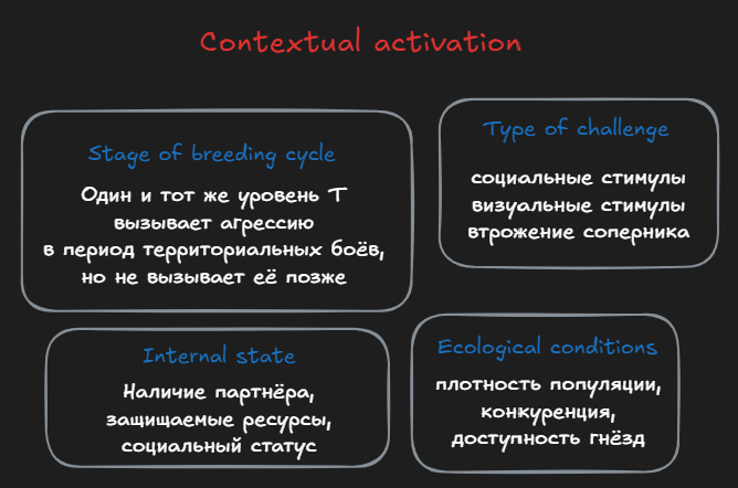Даже если у особи высокий Т, агрессия проявляется только в контексте, где она имеет смысл. А контекст определяется огромным количеством факторов: периодом размножения, наличием ресурса, социальной структурой популяции, плотностью соперников, мотивационным состоянием самой особи.
