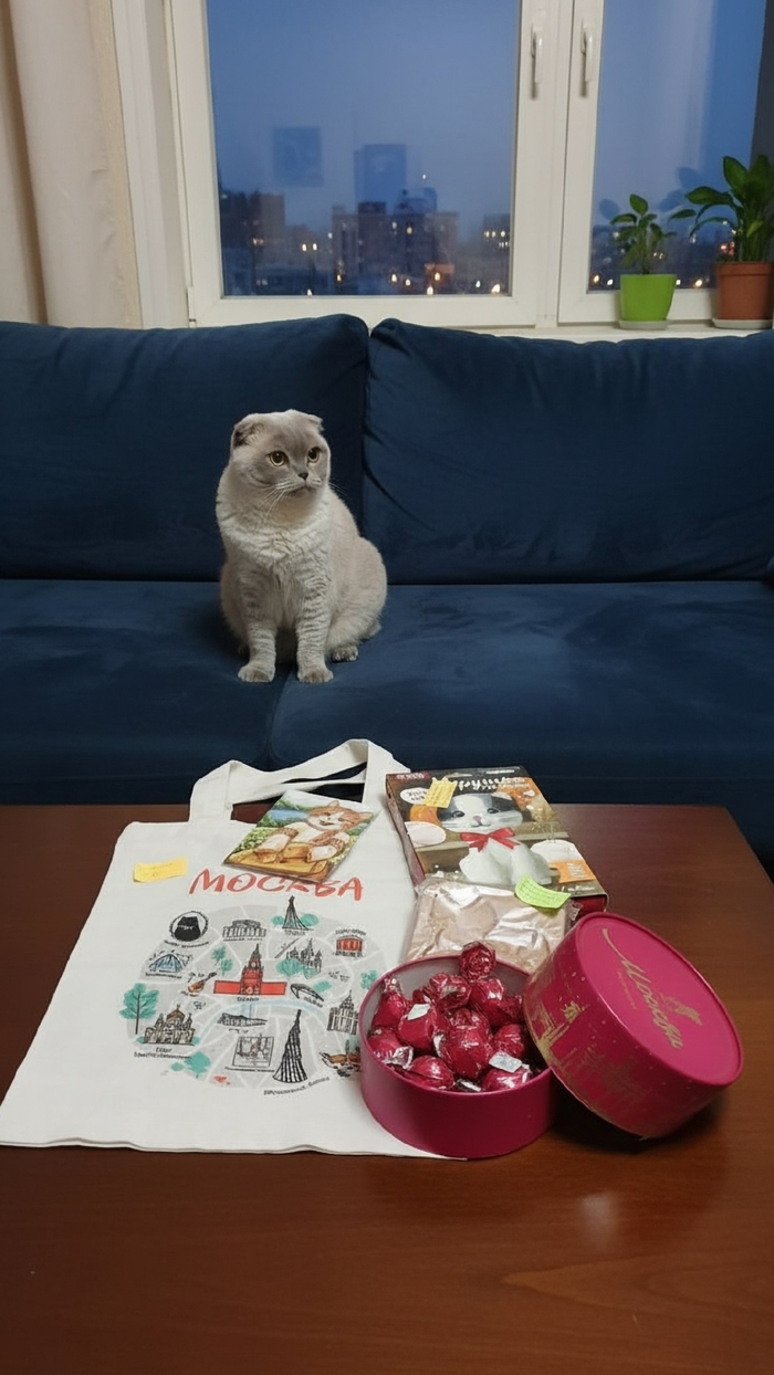 Отправив подарок стала с нетерпением ждать свой. Когда трекнулся номер я увидела что 720 грамм, шкала ждуна стала расти в геометрической прогрессии. А вот и подарки. Котяра как будто не в деле, но ему коробки почтовые не интересны.