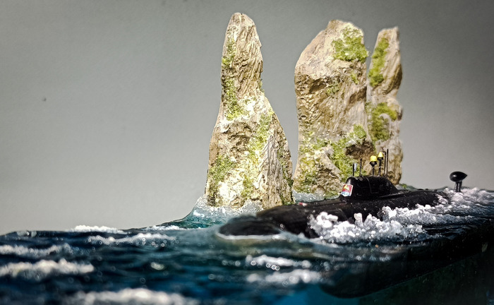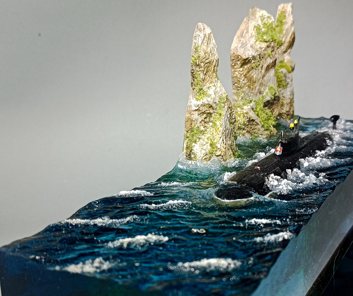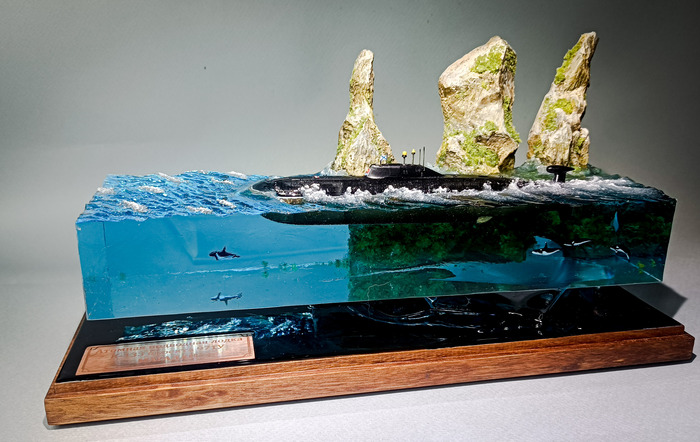 Это не понравилось морскому божеству, он насылал свои мощные волны, но братья давали им отпор. Поняв, что победить их не удастся, морской бог превратил богатырей в скалы. Окаменев, герои не перестали защищать свою бухту и берег, где жили люди. Так и стоят они до сих пор каменными стражами. Моя работа сделана в память о службе и экипаже для моряка подводника. Много лет его лодка проходила на боевое задание мимо Трех братьев . Скалы надёжно защищали его семью на берегу пока моряк нёс службу в тишине океана . Работа сделана из эпоксидной смолы и воспоминаний ветерана подводных сил СССР.. Размер 28см длина 9см ширина 15см высота