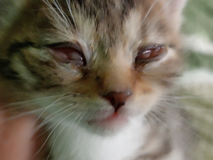 И как следствие, вместе с зубками полезли и проблемы по здоровью. У котят- искуственников и так нет колострального иммунитета, а тут по всей видимости ещё и внутриутробная инфекция... Гноятся глазки, сильные выделения из носа. А один малыш, с большой вероятностью останется слепым(.