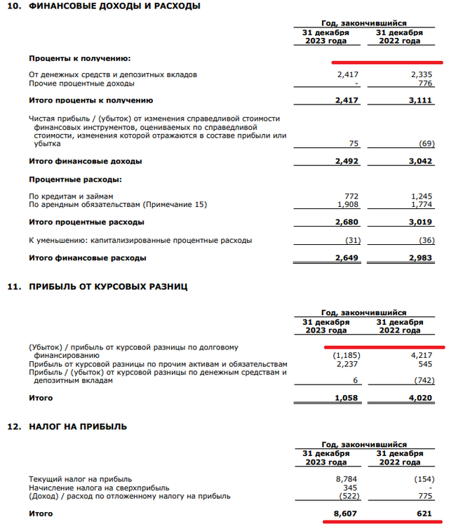🛳 Чистая прибыль снизилась, но по факту она увеличилась, потому что на неё повлияли разовые статьи. Операционная прибыль, как мы видим знатно подросла, поэтому на чистую прибыль повлияли финансовые доходы/расходы (их соотношение стало отрицательным -232₽ млн, но влияние мелкое,отмечу, что % по депозитам выросли, а % по кредитам уменьшились), доход от курсовых разниц — 1₽ млрд (годом ранее 4₽ млрд, мешают кредиты номинированные в валюте, но головная компания от них избавилась полностью, а сама группа погасила краткосрочные, остались долгосрочные). Но самая чувствительная статья — это налоги, в этом году компания заплатила 8,6₽ млрд налогов, когда, как в прошлом, только 621₽ млн, всё дело в том, что группа НМТП выиграла суд у налоговой службы по ранее уплаченному излишнему налогу и государство с барского плеча вернуло в 2022 г. 5,8₽ млрд.