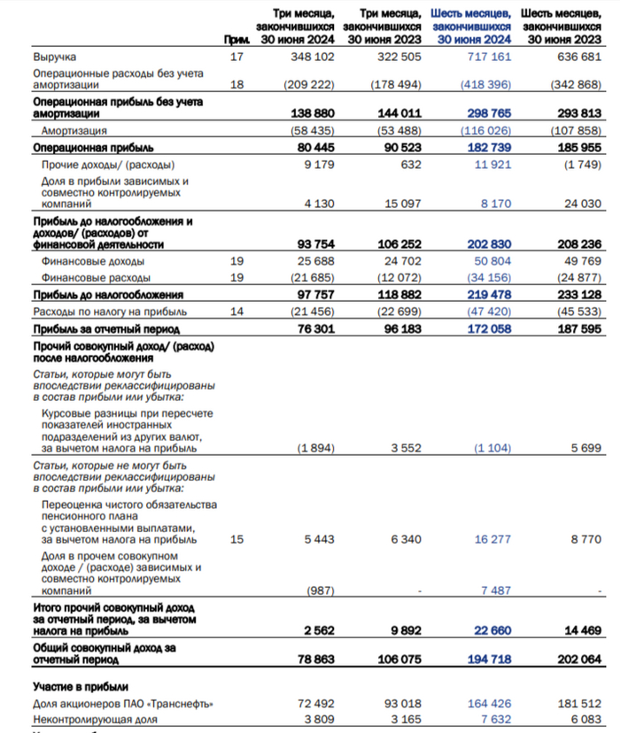 Транснефть отчиталась за I п. 2024 г. — фиксируем снижение опер. прибыли из-за малой индексации тарифов и добровольного сокращения сырья⁠⁠