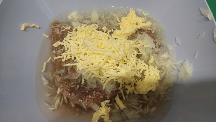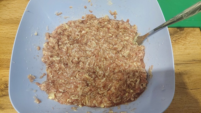После замеса, фарш получается достаточно жидким. Лучше его охладить как следует, чтобы влага не так сильно отделялась. И периодически приходится всё равно перемешивать.