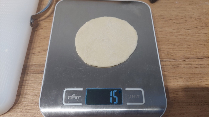 Далее лепим из теста колбаску и режем её на пластинки, которые будем раскатывать.