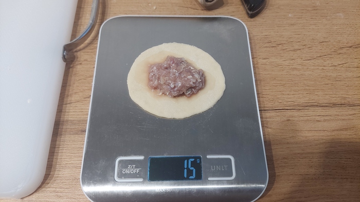 Фигачим туда чайную ложку фарша (это тоже 15 грамм) и защипываем!