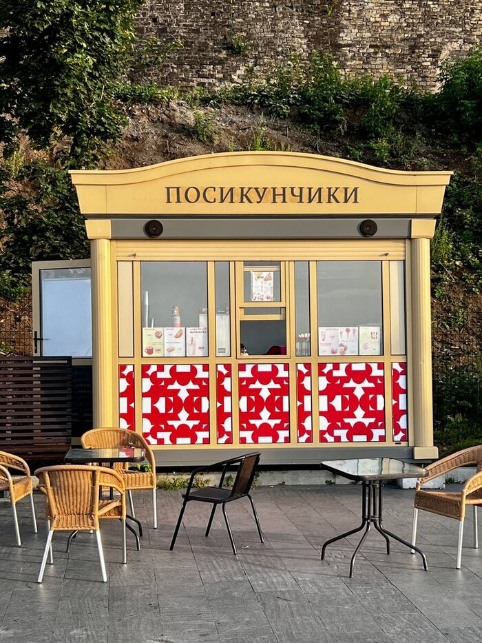 Вход в кафе со двора, перед входом в прошлом году как раз и установили памятник посикунчикам. Он небольшой, но трогательный. На блюде лежат два пирожка — посикунчик и посекунчик. По задумке авторов, желающие поучаствовать в дискуссии по поводу «и» и «е», могут потереть соответствующий пирожок. Сейчас они натерты одинаково.