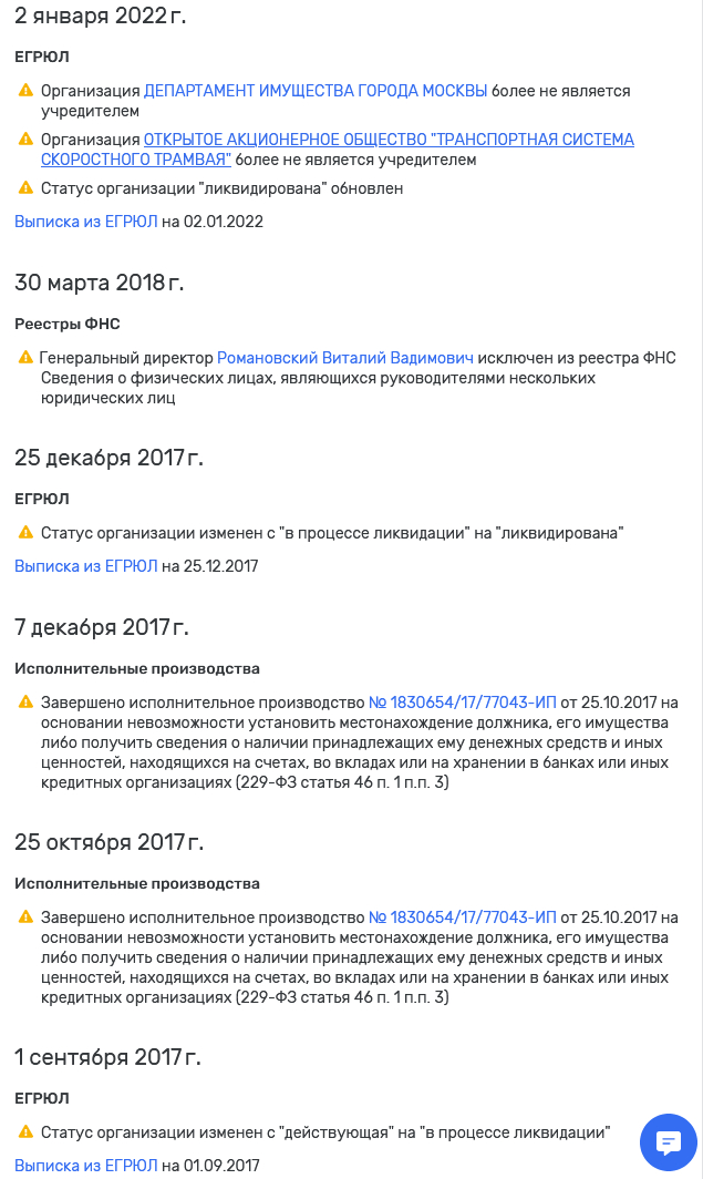 25 декабря 2017 года ОАО "ГТССТ" было исключено из ЕГРЮЛ, как недействующее юридическое лицо. То есть, компания не платила налоги и не осуществляла деятельность несколько лет. В целом, по сведениям из ЕГРЮЛ, компания собрала флеш-рояль нарушений в виде регистрации юр. адреса по адресу множественной регистрации, ненахождения по месту регистрации и гендиректором, который является руководителем нескольких юр. лиц.