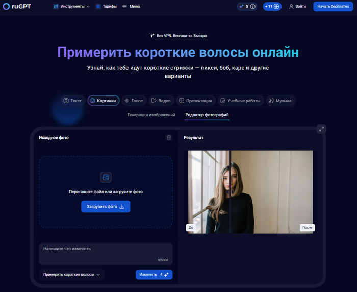 • Можно попробовать бесплатно — доступны стартовые запросы, чтобы протестировать примерку коротких волос и другие инструменты без оплаты.