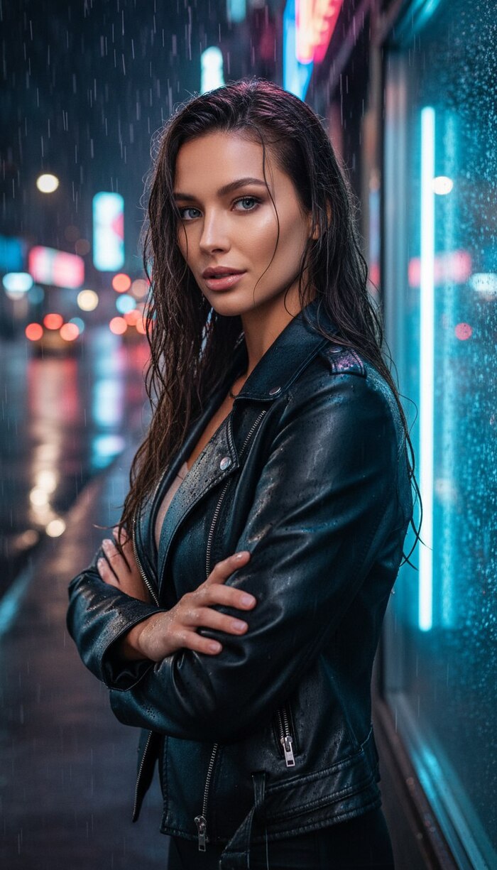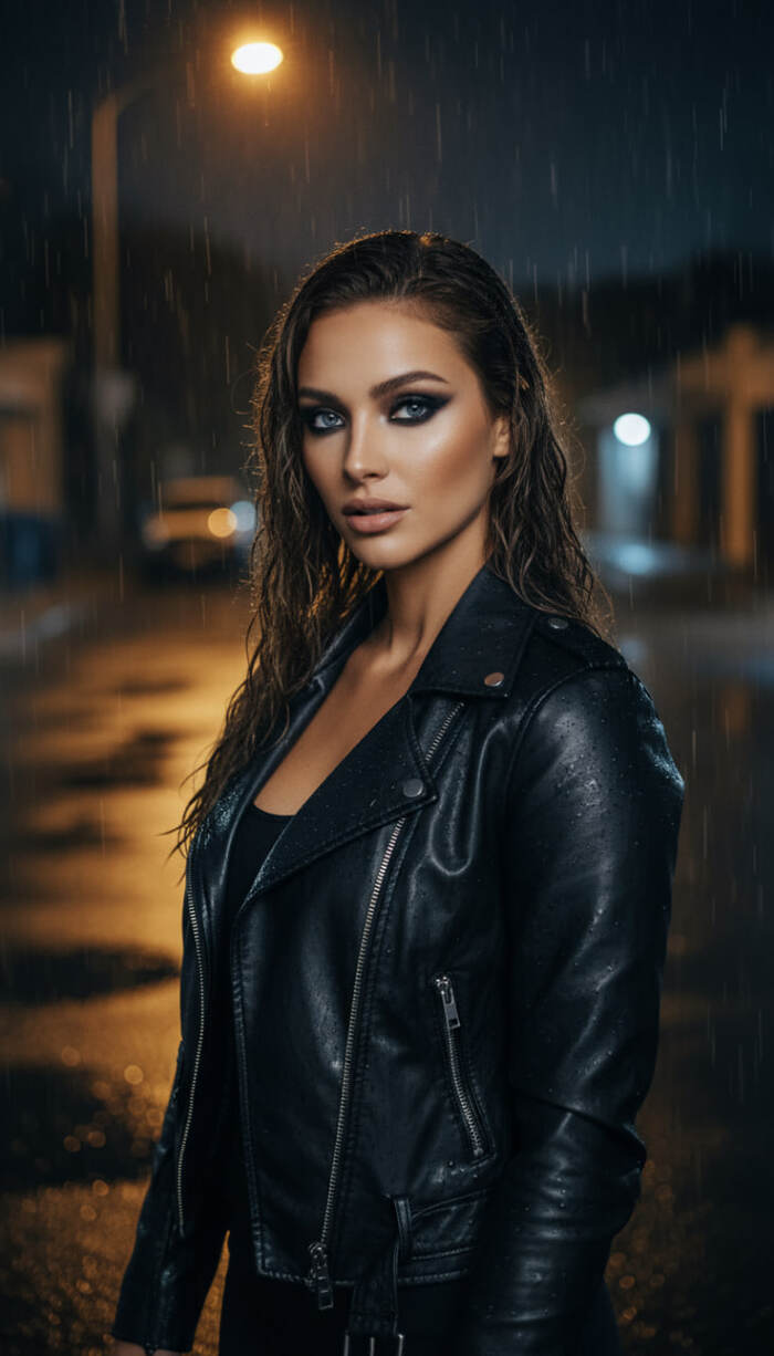cinematic fashion shot of in black leather jacket and smoky eyeliner under moody streetlight, light rain falling, reflective asphalt. tone — sensual, strong, noir aesthetic. HDR 4800 K matte cinematic tone. Full-screen 9:16.