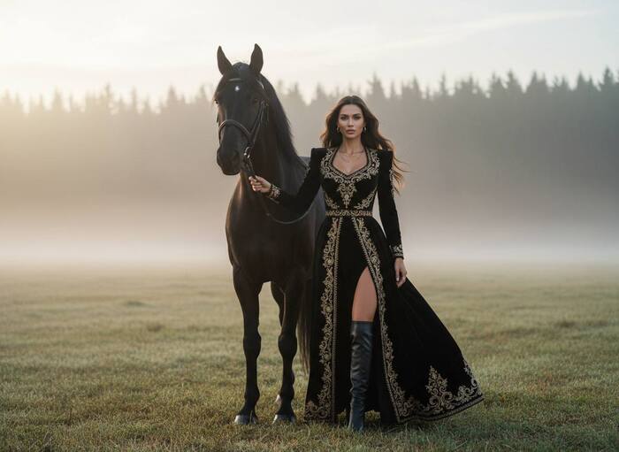 cinematic fashion shot of in black leather jacket and smoky eyeliner under moody streetlight, light rain falling, reflective asphalt. tone — sensual, strong, noir aesthetic. HDR 4800 K matte cinematic tone. Full-screen 9:16. cinematic editorial portrait of a woman standing beside a black horse in a misty open field at dawn, preserve face and proportions exactly. she wears a long flowing black velvet dress with gold embroidery, structured shoulders and fitted waist, paired with tall leather boots and minimal gold jewelry. her hair is styled in loose waves gently moving with the wind. background — soft morning fog, distant forest silhouettes, and subtle sunlight breaking through the mist. warm-cool color balance (4800 K), HDR matte tone, soft rim light from left side, cinematic depth of field. Canon EOS R5 85 mm f/1.8 ISO 200 1/320 s HDR 4800 K matte tone ¾ composition, camera slightly below waist level. Preserve face ON (0.4) | Prompt Weight 1.15 | Seed Lock ON | Mask: outfit + background | Style: Editorial / Cinematic / Luxury Fashion / Outdoor. Full-screen 9:16 frame (no black bars, fill entire image)
