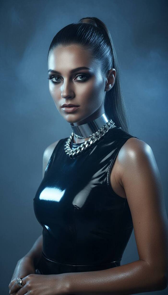 dark glossy fashion editorial portrait under blue-silver rim light, wet skin shine and metallic texture, black latex top, hair pulled back into a sleek ponytail, smoky eye makeup, silver choker and ring, intense direct gaze, dim studio fog behind, Preserve face ON, Canon EOS R5 85 mm f/1.8 ISO 400 1/320 s WB 4800 K HDR cinematic tone ¾ composition camera waist level, Full-screen 9:16 frame (no black bars fill entire image)